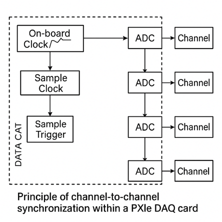 在PXIe體系中,一塊多通道數(shù)據(jù)采集卡通常已經(jīng)針對(duì)“單板多通道同步”進(jìn)行了硬件和驅(qū)動(dòng)層面的設(shè)計(jì)。其基本思想可以概括為:在同一塊采集卡上,為所有通道提供統(tǒng)一的時(shí)間基準(zhǔn)、統(tǒng)一的采樣時(shí)鐘和統(tǒng)一的啟動(dòng)觸發(fā),從而保證采樣時(shí)刻完全一致。下面從幾個(gè)關(guān)鍵方面進(jìn)行解析: