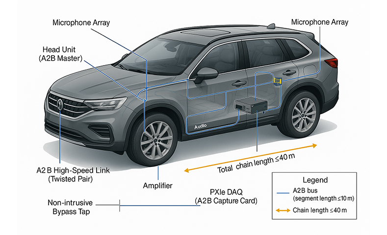 隨著座艙語音交互、主動(dòng)降噪(ANC)與分區(qū)音響的應(yīng)用深化,A2B(Automotive Audio Bus)在整車中承擔(dān)了更多時(shí)序敏感、通道眾多的音頻傳輸任務(wù)。A2B以單對非屏蔽雙絞線實(shí)現(xiàn)音頻與控制的同步傳輸,具備約50 Mbps的帶寬與確定性、微秒級的逐跳時(shí)延,且各節(jié)點(diǎn)時(shí)鐘保持相位對齊,這使其非常適合多麥陣與分區(qū)播放等場景,但也對鏈路穩(wěn)定性和時(shí)序一致性提出更嚴(yán)苛要求。真實(shí)車輛中,電源波動(dòng)、EMC耦合與線束布局可能引發(fā)幀錯(cuò)誤、鏈路重建或抖動(dòng)累積,單靠靜態(tài)臺架往往難以捕獲并復(fù)現(xiàn)。為此,我們基于模塊化數(shù)據(jù)采集平臺,提供專注于A2B鏈路的無損接入、長時(shí)記錄與在線監(jiān)聽方案,通過協(xié)議事件與音頻載荷的同步采集,建立“發(fā)現(xiàn)—定位—復(fù)核—優(yōu)化”的閉環(huán)。