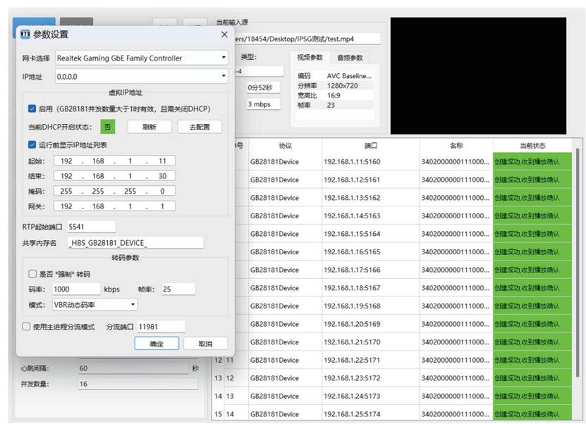 2、開始測試后可根據(jù)設置自動生成區(qū)間內(nèi)的全部IP地址;支持對測試文件進行轉(zhuǎn)碼,可設置碼率、幀率以及轉(zhuǎn)碼模式。