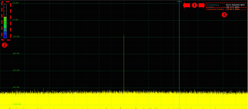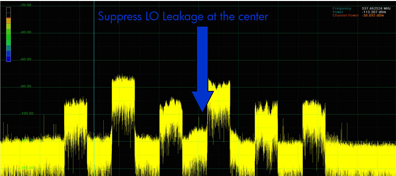 因此射頻采集回放系統(tǒng)是否具有自我優(yōu)化的能力十分重要,同時(shí)為了進(jìn)一步減少本振泄漏對(duì)采集信號(hào)的影響,采集參數(shù)設(shè)置須考慮盡力將儀器的本振頻率點(diǎn)和真實(shí)的射頻信號(hào)錯(cuò)開一些,如下圖所示: