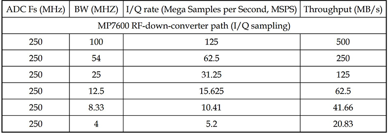 回歸射頻采集的本質(zhì),是將射頻信號(hào)進(jìn)行高數(shù)據(jù)率的IQ解析和存儲(chǔ),因此采樣率和位深決定了采集信號(hào)的精度,RFCS的典型參數(shù)如下表: