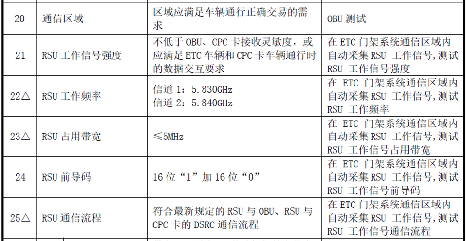 本方案主要測試內(nèi)容為《JTG 2182-2020 公路工程質(zhì)量檢驗評定標準 第二冊 機電工程》標準中6.4 ETC門架系統(tǒng)中表6.4.2 ETC門架系統(tǒng)實測項目中的第20-25項進行測試,包括通信區(qū)域、RSU工作信號強度、RSU工作頻率、RSU占用帶寬、RSU前導(dǎo)碼、RSU通信流程。具體內(nèi)容如下圖: