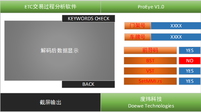 ETC交易過程分析軟件ProEye是一款分析ETC系統(tǒng)通信流程(協(xié)議一致性)的專業(yè)測試軟件。主要是對已錄制的包含ETC射頻交互過程的IQ文件進行分析。支持常用的IQ文件格式;支持解析射頻指標、應(yīng)用層及設(shè)備應(yīng)用層的關(guān)鍵交互語句和特征數(shù)據(jù)。射頻指標包括信號強度、載波頻率、頻率容限、調(diào)制系數(shù)、占用帶寬等指標;應(yīng)用層及設(shè)備應(yīng)用層解析可自動搜索關(guān)鍵交互語句,例如前導(dǎo)碼、BST、VST、SetMMI.rs、SetMMI.rq等信息。以此來判斷ETC系統(tǒng)的通信流程是否正常。支持提供C#的API,供二次開發(fā)使用。