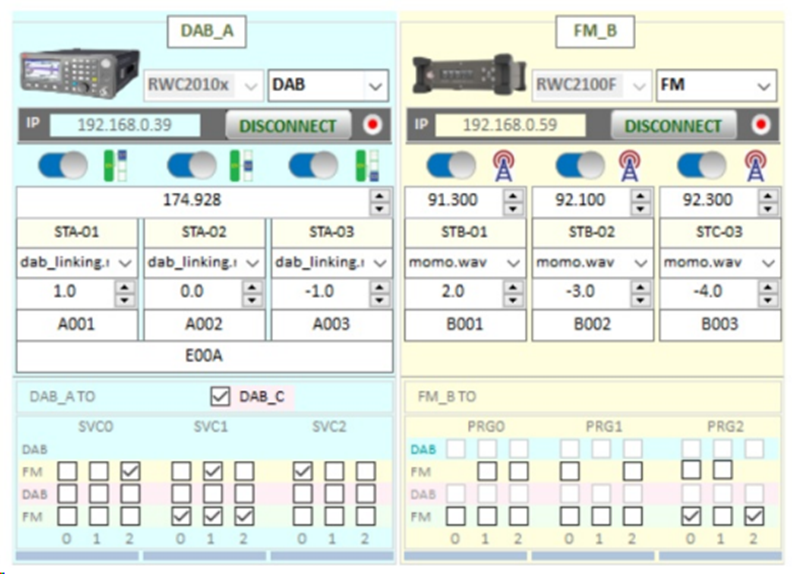 通過以太網(wǎng)的方式將此應(yīng)用程序與每個(gè)設(shè)備連接后即可在此模塊中查看設(shè)備的連接狀態(tài)。每個(gè)設(shè)備有3個(gè)開關(guān),根據(jù)所連接的設(shè)備或傳輸方式的不同,開關(guān)所控制的功能也不同。當(dāng)連接RWC2010C并處于DAB或DRM模式下時(shí),開關(guān)表示總成信號(hào)中有3個(gè)業(yè)務(wù),每個(gè)業(yè)務(wù)都可單獨(dú)打開或者關(guān)閉;當(dāng)連接RWC2100F時(shí),開關(guān)表示3個(gè)FM發(fā)射機(jī)。值得一提的是,RWC2010C在DAB模式下一個(gè)總成信號(hào)中可以提供最多64個(gè)業(yè)務(wù),在DRM模式下一路復(fù)用可接入4個(gè)業(yè)務(wù),軟件中為了便于測(cè)試均只設(shè)置3個(gè)業(yè)務(wù)。此外,所連接的設(shè)備不同,軟件中顯示的參數(shù)以及屬性也會(huì)有所不同。