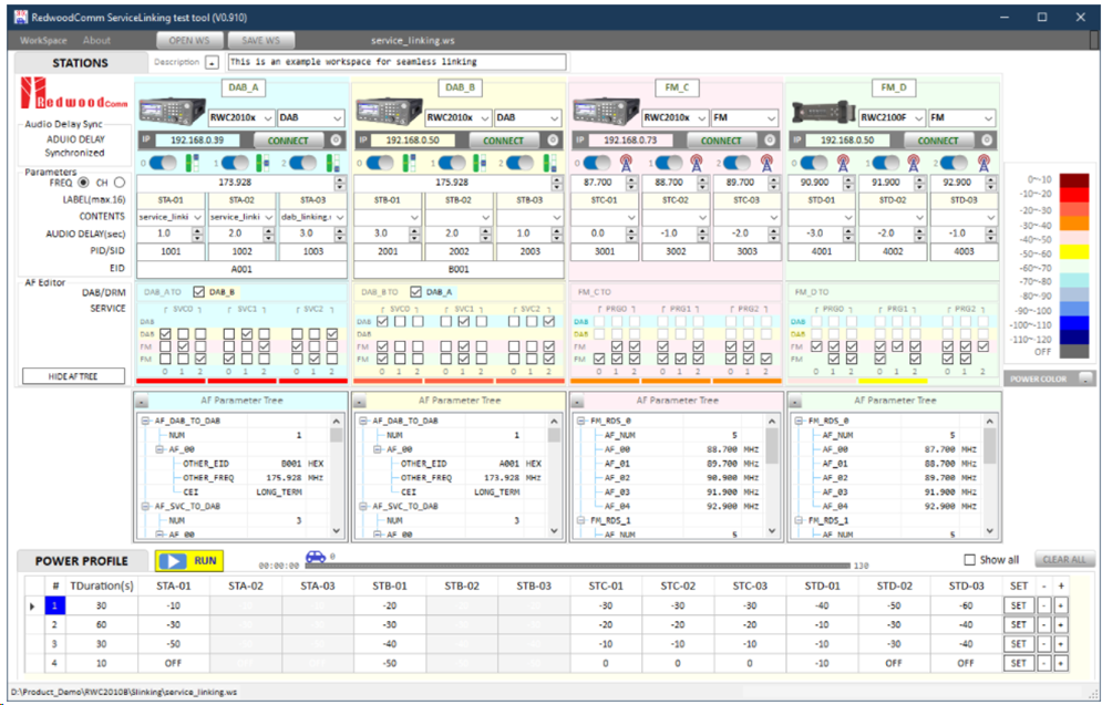 可以在功率配置器中導(dǎo)入功率配置文件,也可單獨(dú)設(shè)置每個(gè)發(fā)射機(jī)的功率水平,便于用戶模擬真實(shí)現(xiàn)場(chǎng)可能發(fā)生的各種發(fā)射機(jī)與無(wú)線電廣播信號(hào)環(huán)境。所有功率值都將根據(jù)所連接的設(shè)備自動(dòng)的檢查并限制大小,確保儀器能夠正常工作。