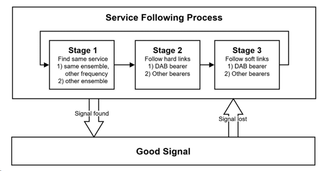 階段一:嘗試在當(dāng)前區(qū)域的其他總成信號(hào)中查找擁有相同SId的DAB業(yè)務(wù)。需識(shí)別所有擁有與當(dāng)前節(jié)目“完全相同”業(yè)務(wù)信息的DAB總成信號(hào)。接收機(jī)也將只返回?cái)y帶與用戶選擇的業(yè)務(wù)相同的業(yè)務(wù)(即相同的ECC與SId)的總成信號(hào)。這個(gè)階段中應(yīng)優(yōu)先傳輸與用戶原本選擇的業(yè)務(wù)含有相同業(yè)務(wù)的那個(gè)頻率的總成信號(hào)。