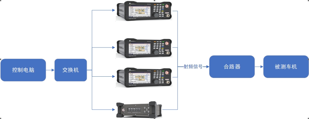 首先進(jìn)行硬件設(shè)備的連接準(zhǔn)備。使用網(wǎng)線與交換機(jī)將控制電腦與三臺(tái)RWC2010C與一臺(tái)RWC2100F相連接(以下將使用設(shè)備1、設(shè)備2、設(shè)備3分別表示三臺(tái)RWC2010C,使用設(shè)備4表示RWC2100F),在控制軟件上確認(rèn)設(shè)備的接通狀態(tài)。將四臺(tái)設(shè)備輸出的信號(hào)經(jīng)過合路器后輸入給被測(cè)車機(jī)進(jìn)行測(cè)試。