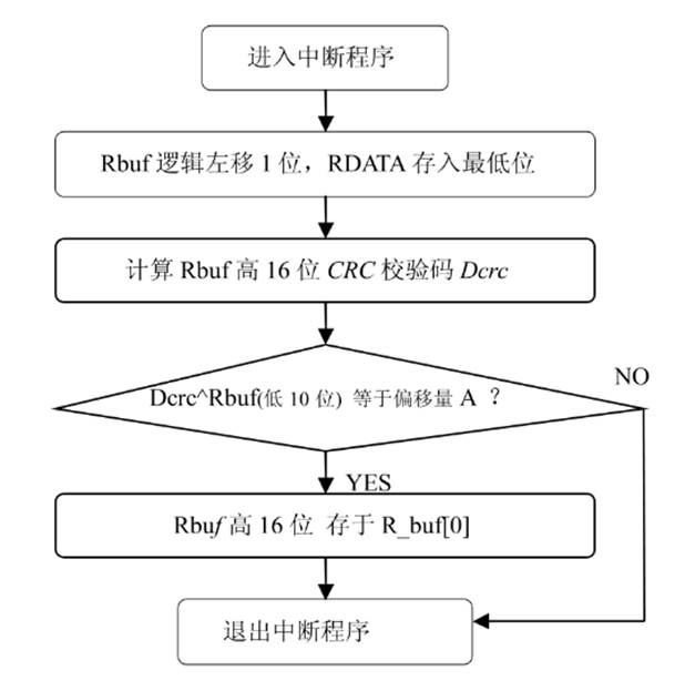 根據(jù)該多項式對高16位數(shù)據(jù)進行CRC校驗碼計算得到校驗碼Drc再和低10位數(shù)據(jù)做異或運算,如果該運算結(jié)果等于數(shù)據(jù)塊1的同步字偏量A,則表明數(shù)據(jù)塊1的數(shù)據(jù)接收正確完成。Rbuf的高16位數(shù)據(jù)就是數(shù)據(jù)塊1的有效信息代碼。接收流程如圖五所示。