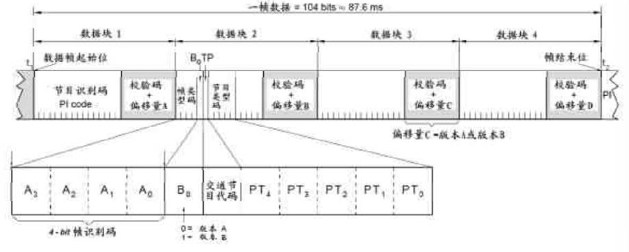 RDS的數(shù)據(jù)信號傳送是以為一個基本單元,一次有效的數(shù)據(jù)采集至少是一個完整的數(shù)據(jù)幀。一幀數(shù)據(jù)由4個數(shù)據(jù)塊組成,每個數(shù)據(jù)塊包含26比特數(shù)據(jù)位高16位是信息代碼,低10位是校驗碼和數(shù)據(jù)塊識別號(即圖中偏移量)。數(shù)據(jù)傳輸比特率是1187.5Hz。所以一幀數(shù)據(jù)共有104比特,傳輸時間約為87.6毫秒,也就是說每秒鐘可傳送148個字節(jié)的信息,除去冗余信息,有效的信息載荷為92字節(jié)。