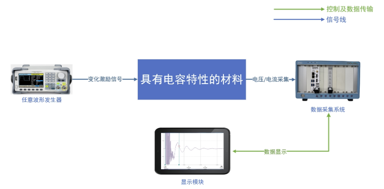 針對上述具有電容特性的材料,我司推出了一套基于數(shù)采系統(tǒng)和任意波形發(fā)生器的測試方案,可以有效測試不同類型材料的充放電性能。