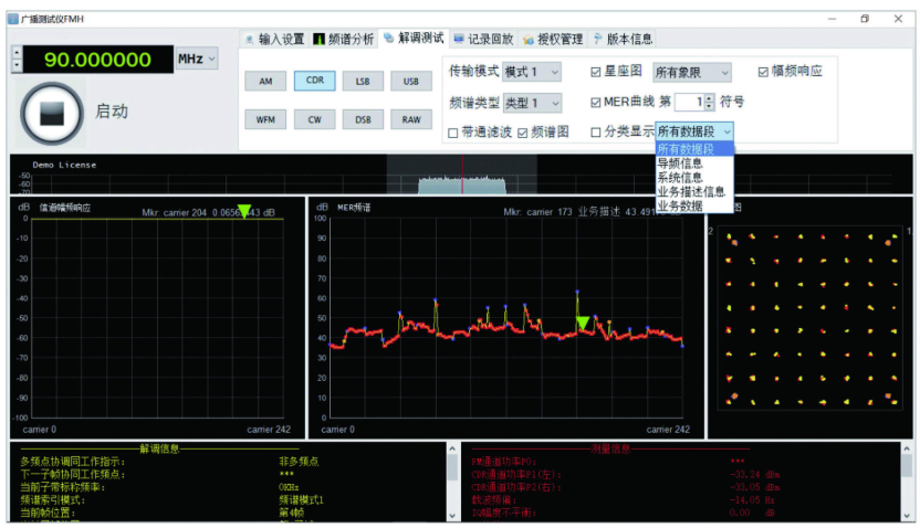 針對(duì)CDR測(cè)試,F(xiàn)MH可測(cè)試電平/星座圖/MER和IQ特征,FMH的高M(jìn)ER測(cè)試能力使其直接進(jìn)入到發(fā)射機(jī)測(cè)試的前沿儀器,綜合MER實(shí)時(shí)測(cè)試能力達(dá)到45dB(純數(shù)字CDR),并可細(xì)分測(cè)試標(biāo)準(zhǔn)所涉及的各層面MER參數(shù),針對(duì)各子載波的MER曲線,并可測(cè)試IQ失真及幅頻響應(yīng)。針對(duì)外場(chǎng)測(cè)試,F(xiàn)MH具有行業(yè)前列的接收靈敏度,確保對(duì)低信號(hào)的捕獲分析。同時(shí)FMH具有頻譜瀑布圖和頻譜監(jiān)測(cè)功能,并可記錄IQ數(shù)據(jù)以便后期回放測(cè)試。這些功能特點(diǎn)無疑使得FMH集多種特色功能于一身,必將帶給發(fā)射臺(tái)工程師諸多額外的價(jià)值。