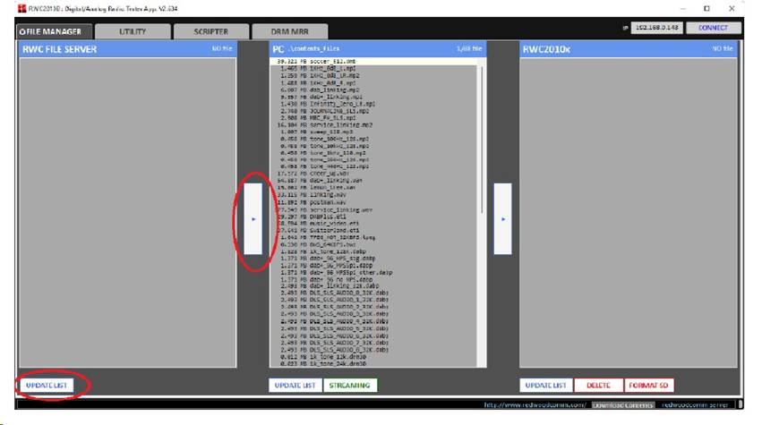 要獲取示例PNG文件,請運(yùn)行RWC2010_utility.exe程序并選擇FILE MANAGER。然后,點(diǎn)擊更新列表圖標(biāo),從左下角的RedwoodComm文件服務(wù)器獲取文件列表。選擇需要下載的文件,點(diǎn)擊下載圖標(biāo)(RWC FILE服務(wù)器與PC機(jī)之間的箭頭按鈕)。