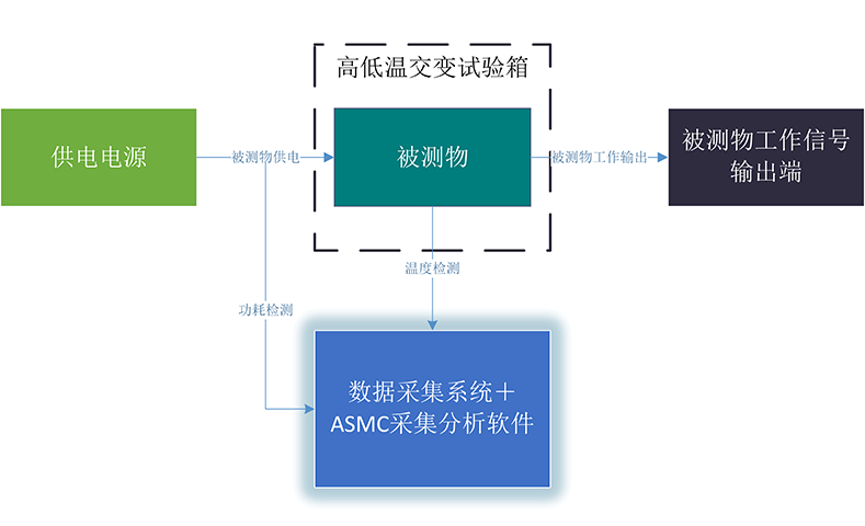 通過硬件與軟件的協(xié)同,本平臺可實現(xiàn)對被測物在標(biāo)定過程中的溫度變化、功耗等關(guān)鍵參數(shù)的同步測量與分析。測試過程從將被測物置入可編程高低溫交變試驗箱開始,試驗箱根據(jù)設(shè)定的溫濕曲線對設(shè)備施加環(huán)境應(yīng)力,模擬真實工作環(huán)境。外部可編程電源為被測物提供持續(xù)供電,必要時可接入輸出信號接收模塊,以實時判定設(shè)備在極端溫度下的功能狀態(tài)。溫度測量采用多通道熱電偶:探頭經(jīng)溫度采集卡由箱體外引入,既監(jiān)測被測物外殼或熱點(diǎn),又專設(shè)一路環(huán)境溫度通道;通道數(shù)量可按項目需求自由配置。功耗測試則由功耗采集卡直接接入供電回路,同步采集電壓、電流并即時計算功率。所有采集板卡安裝于 PXIe 機(jī)箱,ASMC 控制與分析軟件統(tǒng)一調(diào)度硬件資源,實時可視化溫升與功率曲線,自動保存原始數(shù)據(jù)并生成測試報告。得益于模塊化板卡和可編程溫箱的設(shè)計,系統(tǒng)可隨時擴(kuò)充測試通道或提高應(yīng)力等級,滿足后續(xù)迭代需求。
