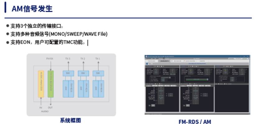 測試對象為FM-RDS的接收機(jī),使用我司的RWC2100F可輸出標(biāo)準(zhǔn)的FM-RDS信號,并且具備可編輯的RDS信息功能,從而實(shí)現(xiàn)全面可控的接收機(jī)功能測試。并且我司的RWC2100F具備音頻分析的能力,可通過發(fā)送信號,接收機(jī)接收,同時分析接收機(jī)輸出的音頻信號,形成環(huán)路測試,全方位測試接收機(jī)的RDS接收性能。