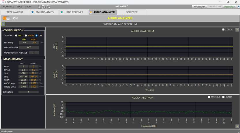 RWC2100F的音頻分析功能不僅可以測量音頻信號質(zhì)量(SINAD、THD+N和SNR)和頻率,還可以顯示音頻波形和音頻頻譜。所有功能均可由PC機(jī)軟件控制,所有參數(shù)均可保存和加載。